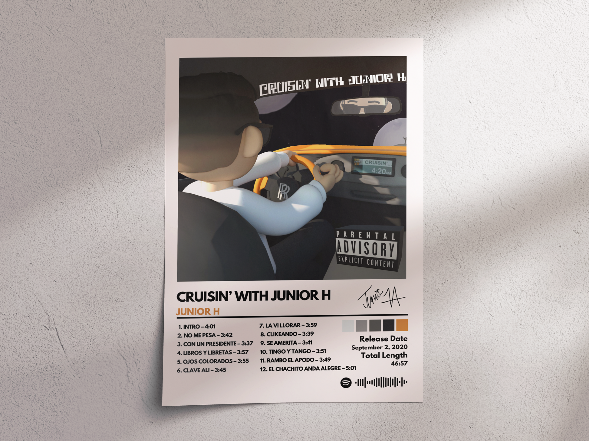 Capture the laid-back vibe of a perfect drive with the Cruisin’ with Junior H album cover poster, featuring smooth, animated style artwork.