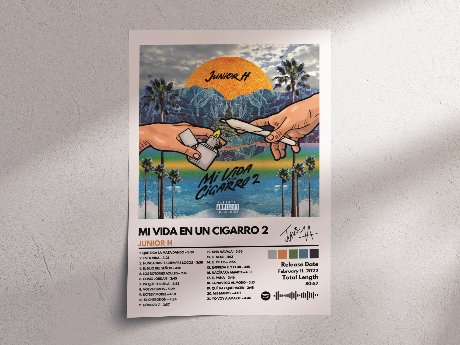Celebrate Junior H’s vibrant style with the Mi Vida en un Cigarro 2 album cover poster, featuring a bold and colorful design perfect for any fan’s space.
