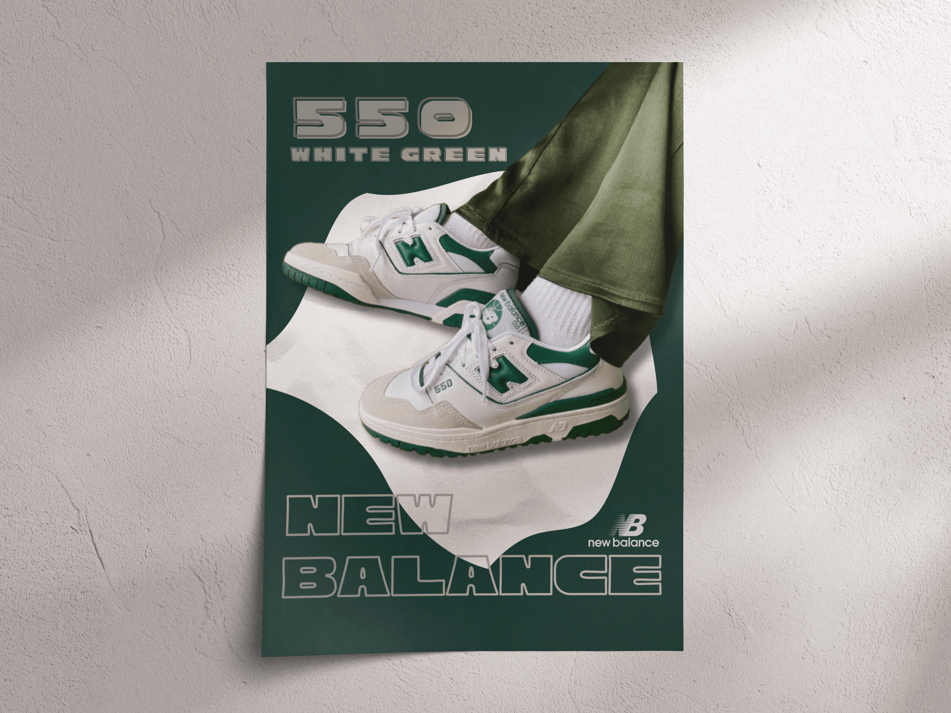 Retro athletic style gets a clean refresh in this New Balance 550 poster. With its white and green color palette and vintage-style layout, it brings together old-school charm and modern edge. Great for sneakerheads and minimalist design fans alike.