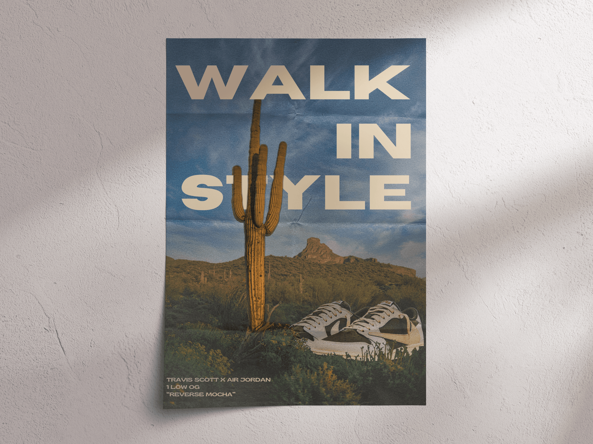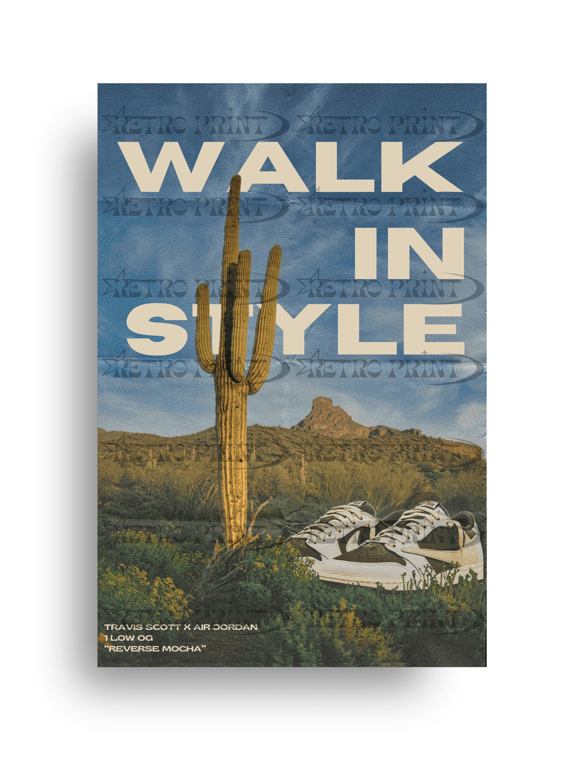Inspired by the iconic Travis Scott x Air Jordan 1 “Reverse Mocha,” this poster brings a rugged, desert-inspired vibe to your space. Set against a cactus-lined backdrop with vintage-style fonts, it merges Western flair with modern sneaker culture. A standout piece for fans of hype kicks and bold design.